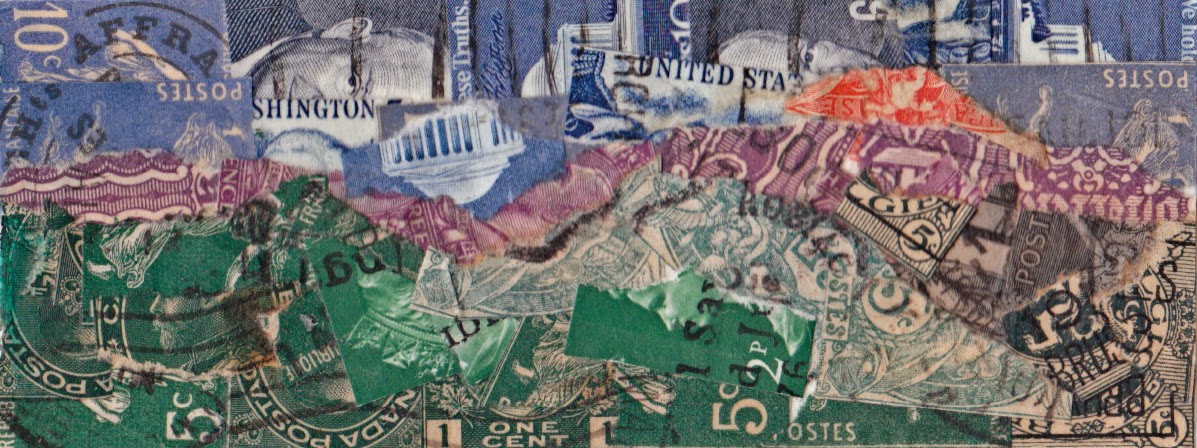 This is my second attempt. This time instead of working completely from imagination, I had an old photo from a vacation. The original featured green fields in the foreground, a sliver of water, distant fields and a pale sky. I'm not sure I like this collage as well, and perhaps it is because the torn stamp in no real way resemble the source. Perhaps imagination is better for this sort of thing.